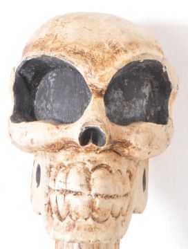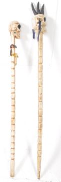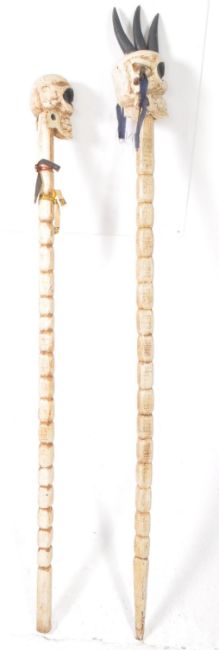 Two vintage 20th century novetly decrotive skull sticks / pole. Carved wooden sticks with skull to top sporting a punk hair style. Measures approx:178cm