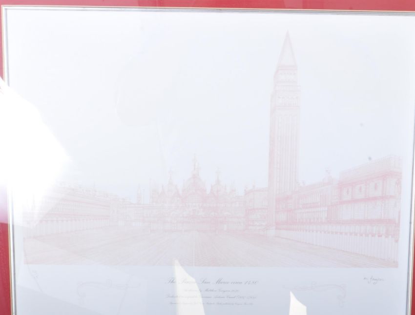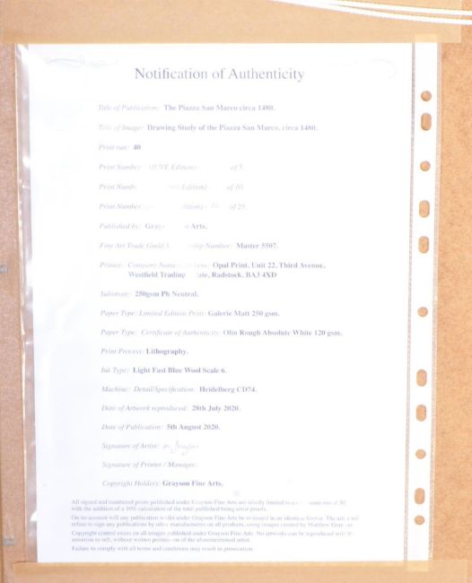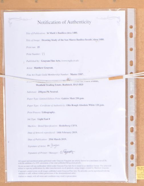 After Grayson Matthew (B.1965) - Three 21st century limited edition Venetian prints of original drawings by Grayson Matthew. Comprised of 'The Facade of the San Marco Basilica' no. 23/25 signed by the artist, 'The Piazza San Marco circa 1480' no. 13/35 signed by the artist and 'The Piazza San Marco circa 1480' no. 10/25 signed by the artist. All framed, mounted and glazed. Largest measures approx: 60x70cm