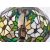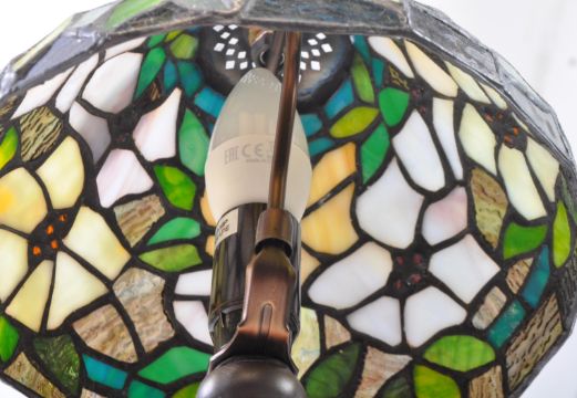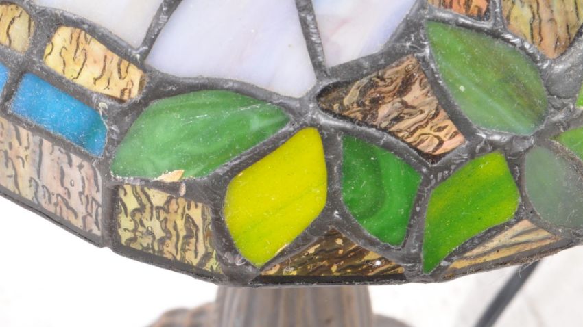 A vintage 20th century Tiffany manner table lamp. The lamp raised on a shaped base with relief designs. Having leaded glass shade to top, with finial top. Measures approx: 39x17cm