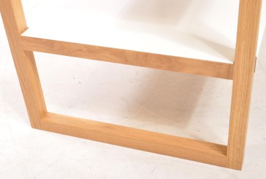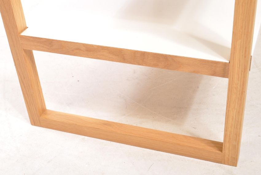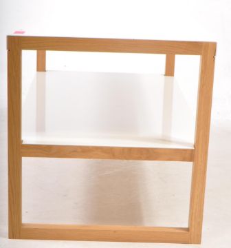 The Kilo rectangular low table was created by Elling Ekornes and Trine Haddal Hovet, exclusively for Habitat, with lacquered solid oak legs and white alloy top and lower shelf. Measures approximately 46H x 85W x 44D in centimeters.