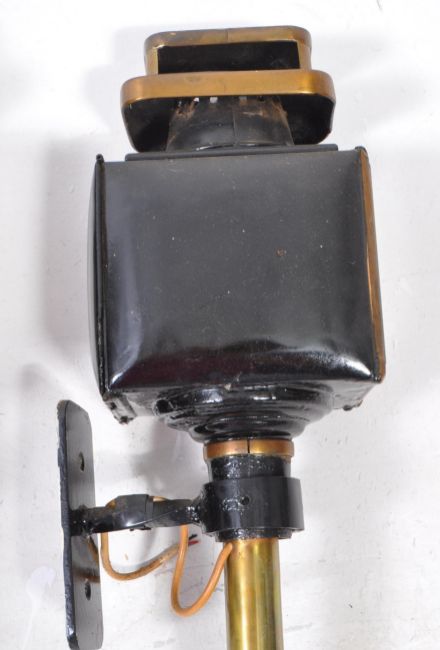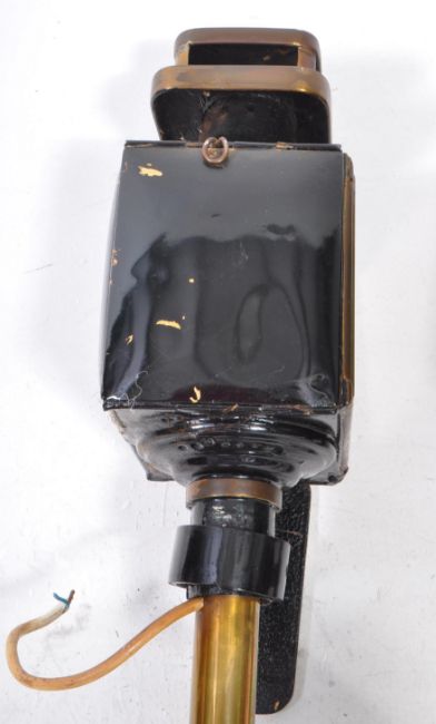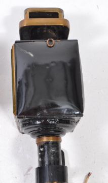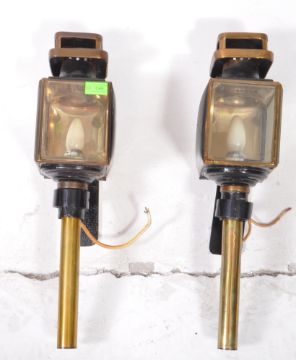 A pair of early 20th century coaching lamps. Ebonised brass construction with central column into a glass house light and stepped deco style top. Measures approx: 57x14x19cm