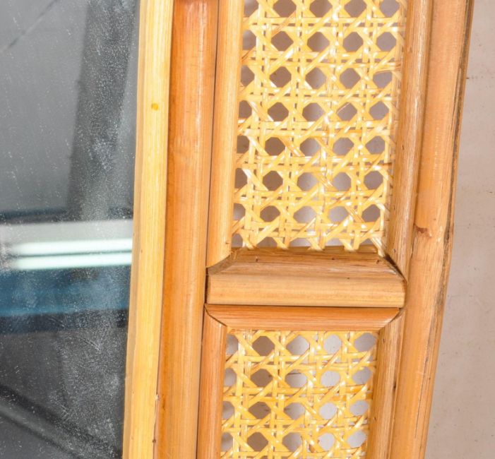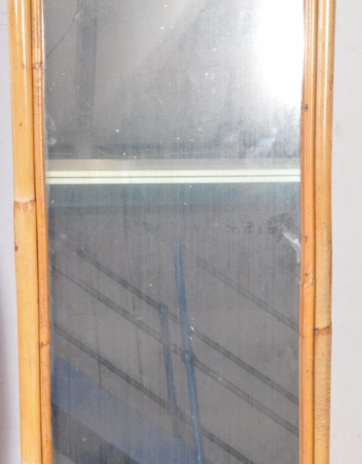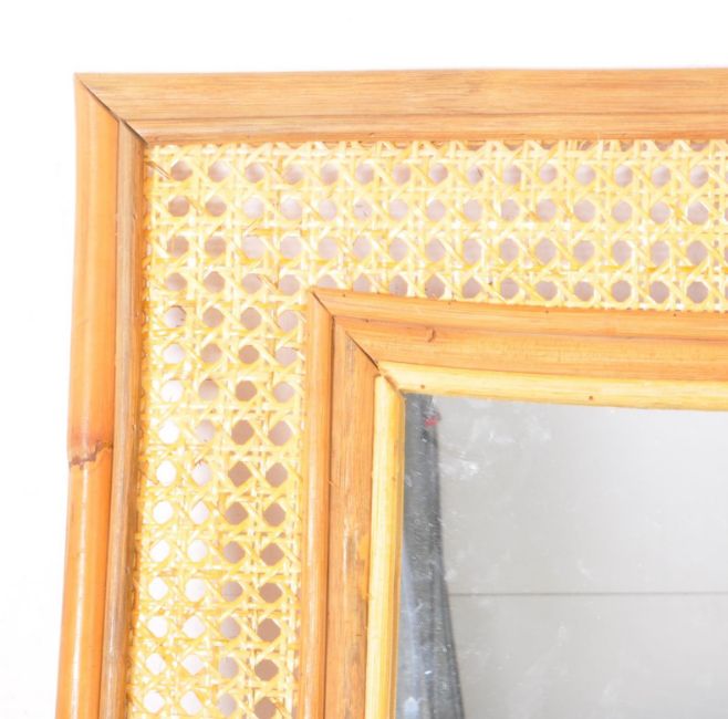 Two mid century bamboo wall mirrors. Square form with central glass mirror panel and rattan border. With a rectangular example with cane work support. Larger measures approx: 120x35cm