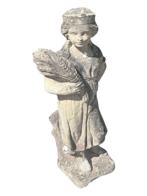 A collection of three 20th century stone composite garden sculptures. To include a courting couple, a female bust and a robed infant.