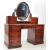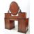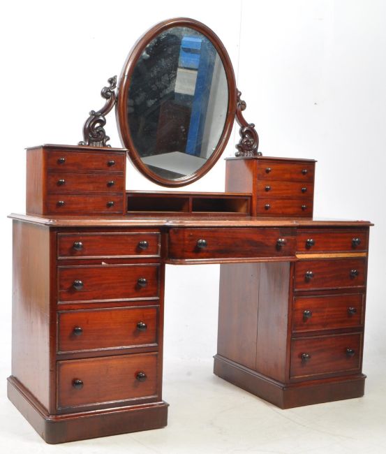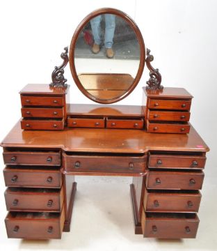 19th century Victorian mahogany breakfront dressing table. Having an oval mirror top set on acanthus leaves Art Nouveau stand. With smaller drawers set atop a rectangular base with knee hole centre with drawer above. Flanked by a bank of four graduating drawers with turned wooden pulls raised on a plinth base. Measures approx:156x140x63cm