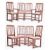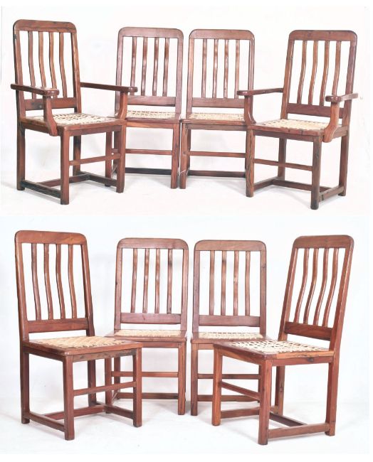 A set of eight retro mid 20th century circa 1970s teak & leather straps dining chairs. Each chair having a curved backrest with rail splats. Woven white leather straps seats. Raised on squared supports united by stretchers. To include two carvers.