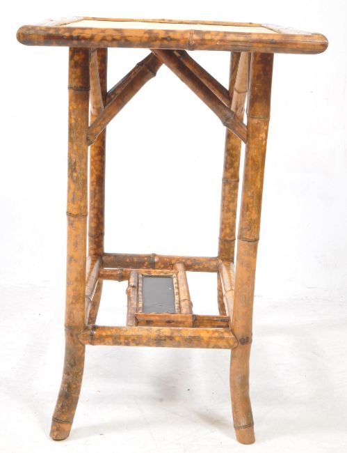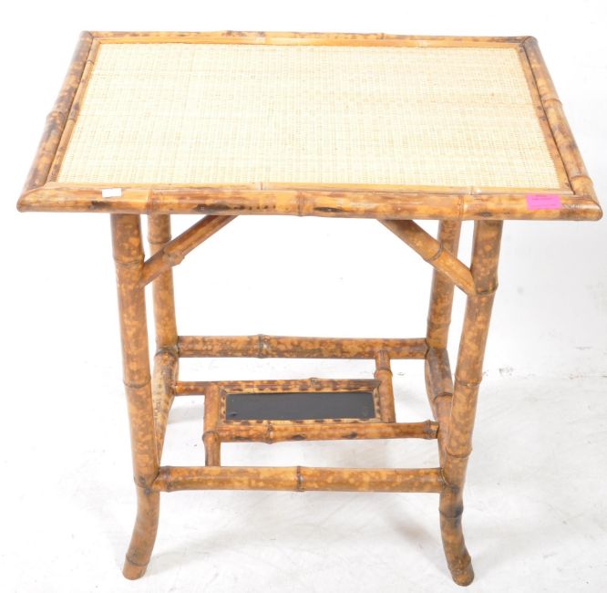 A 19th century Victorian Aesthetic / Chinoiserie period bamboo side table. The table having tiger bamboo frame and supports with hessian atop with black lacquered undertier painted with Chinese characters. Measures approx: 72x66x46cm