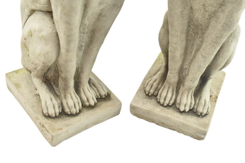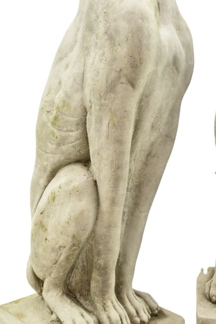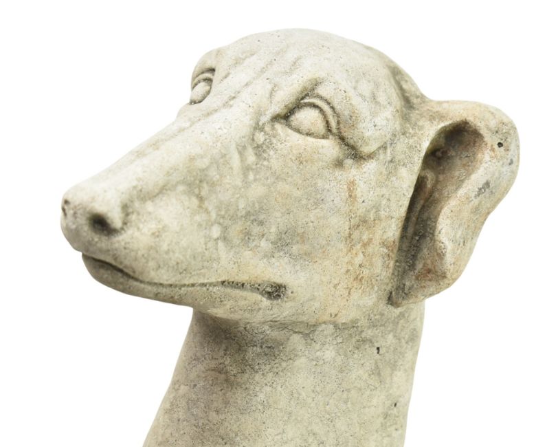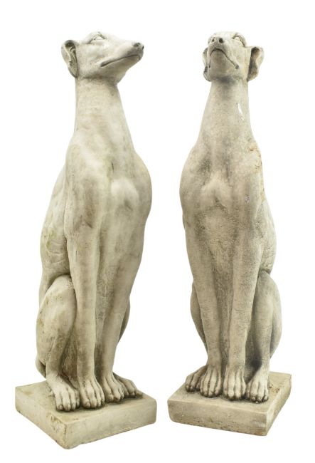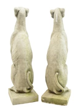 A pair of 20th century composite stone garden decorative dog figures. Each whippet dog modelled seated & upright.