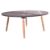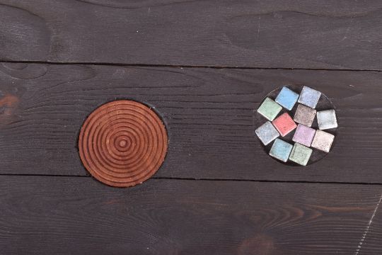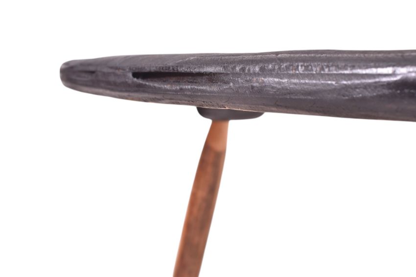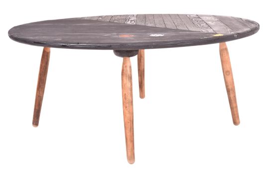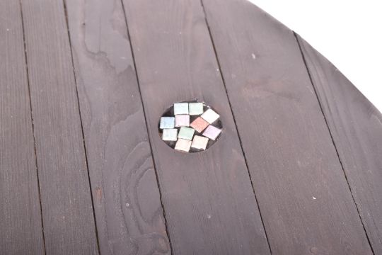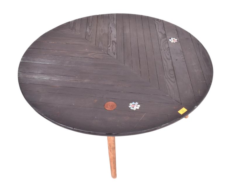 A contemporary bespoke-made coffee table / low table. The table having a circular ebonsied slatted pine top inset with coloured roundals with all raised on tapering supports.