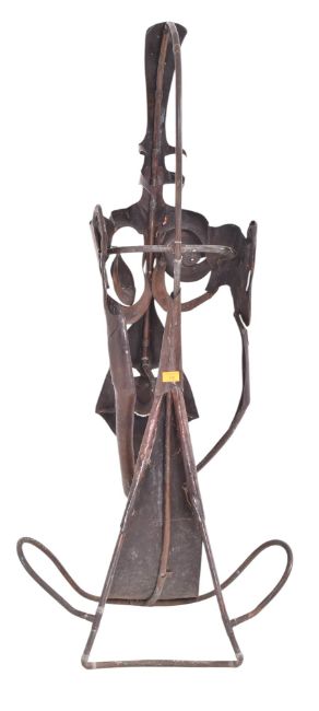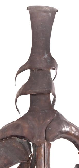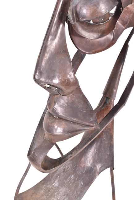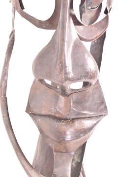 A contemporary bespoke made welded copper figurative sculpture. The sculpture depicting a face with moulded features on a tubular structure. One eye loose but present.