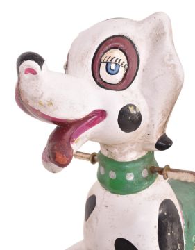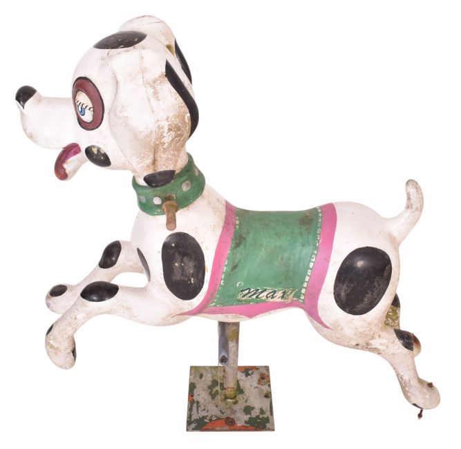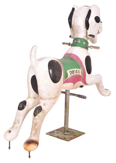 A vintage funfair / fairground / amusement park juvenile arcade game ride in the form of a Dalmatian dog. The dog in cartoon style, named to side Max.