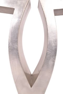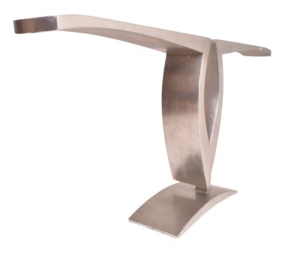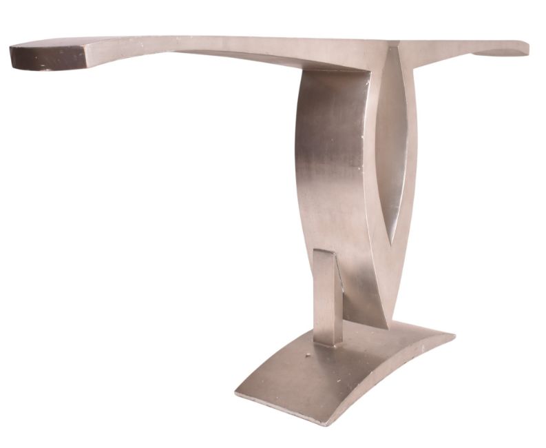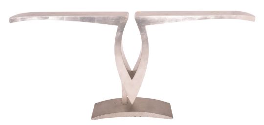 A large 20th century 1980s French Hollywood Regency manner console side table. The table having a wooden body painted in aluminium colourway, raised on shaped metal base.