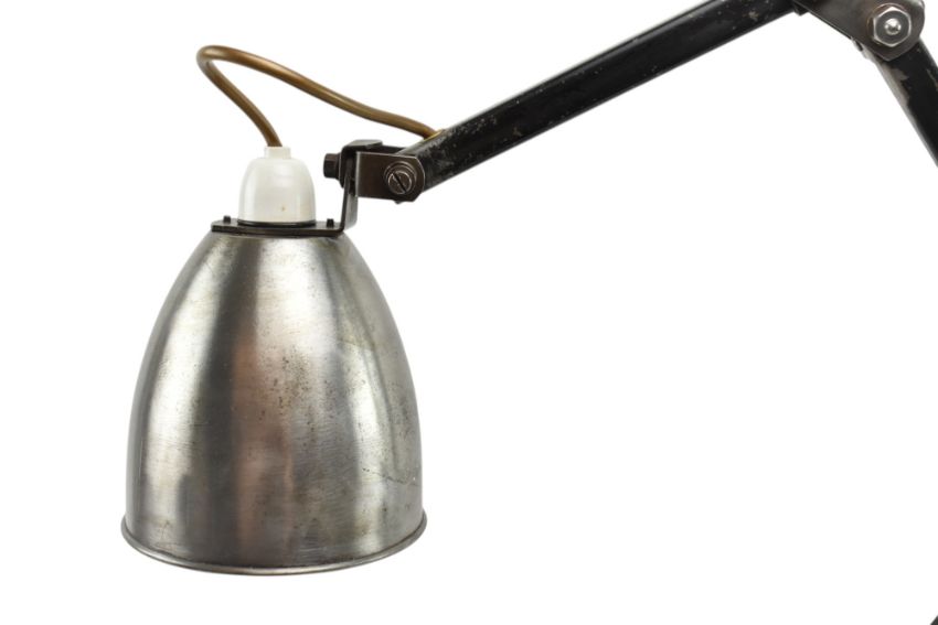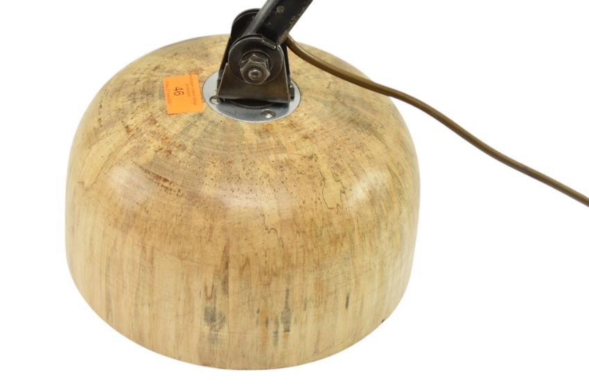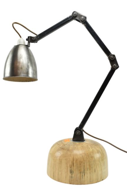 Memlite - a retro 1950s upcycled industrial factory mountable work desk / machinist's lamp light. The lamp having a conical gun metal shade mounted on a two-part adjustable arm. All raised and mounted on a polished wooden base. Sold as untested.