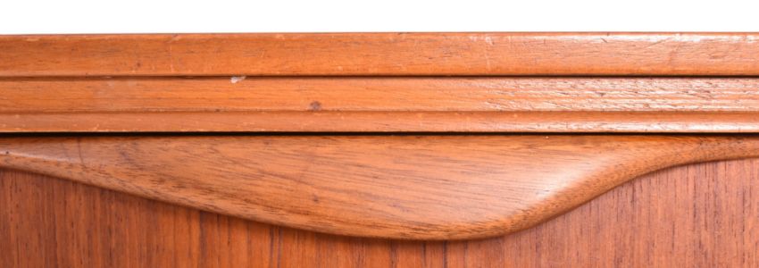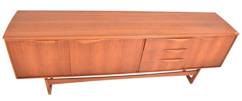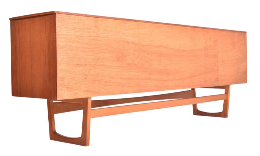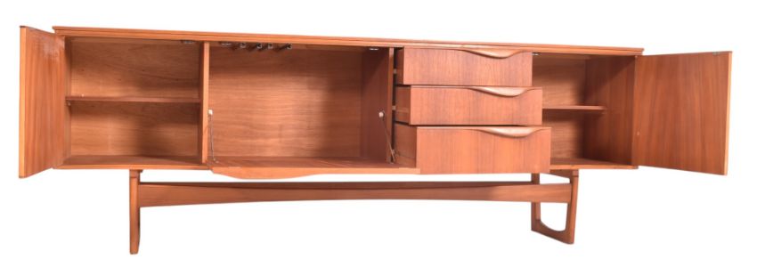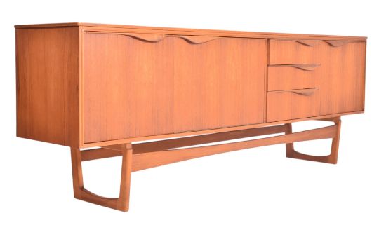 William Lawrence of Nottingham - a retro mid century circa 1960s teak veneered sideboard credenza. The sideboard features three offset drawers flanked by cupboard compartments to each side. Each door having curved handles with all raised on Quadrille style supports.