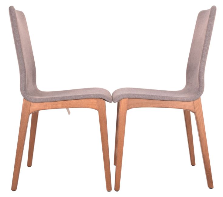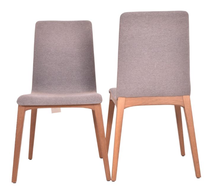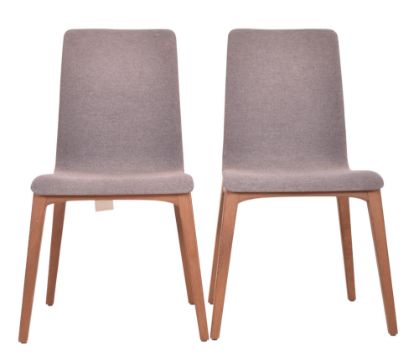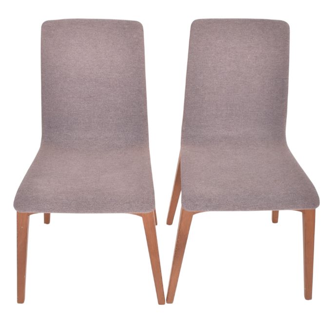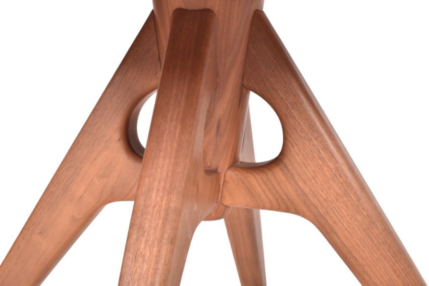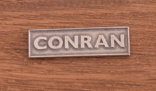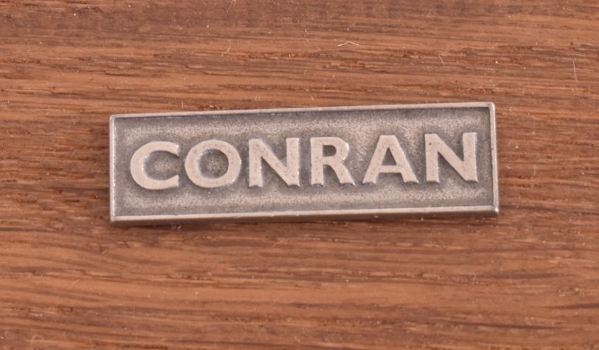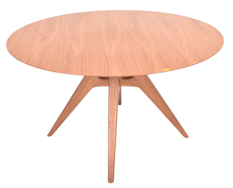 Jader Almeida (Brazilian) - a modern high-end designer walnut dining table and six chairs. The table having a large polished circular top supported by a stylish four-legged splayed base, with maker's label. The set of six chairs by Italian makers Conran, with each being gery upholstered, raised on walnut supports, each with makers' labels.