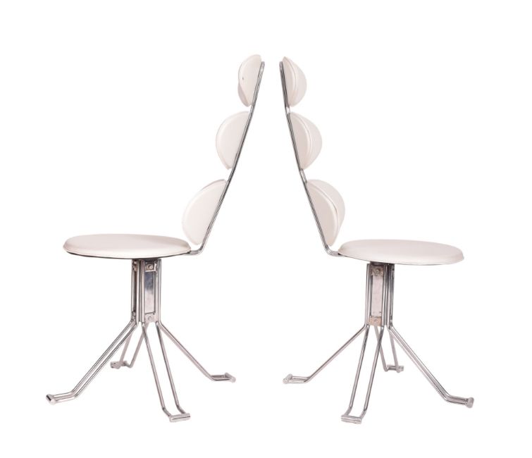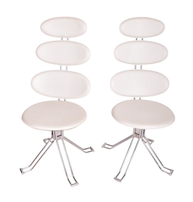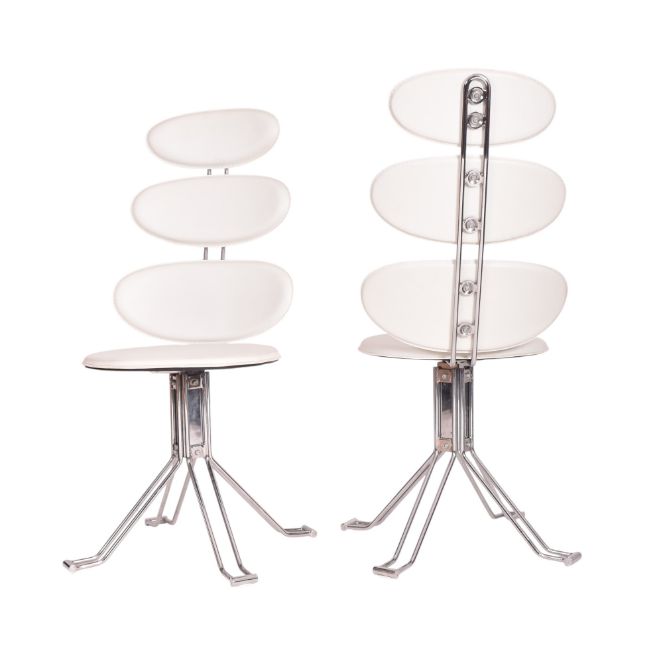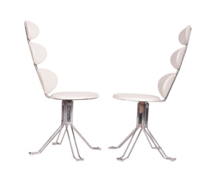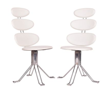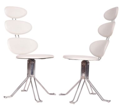 After Poul Volther - Corona Chairs - a pair of contemporary swivel office chairs. Each having white vinyl upholstery to the pebble style backrest and seat. All being raised on a flattened polished steel frame and quatrefoil base.
