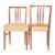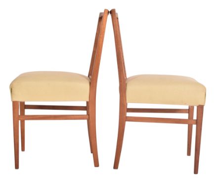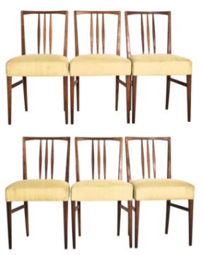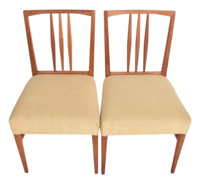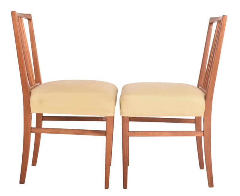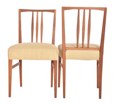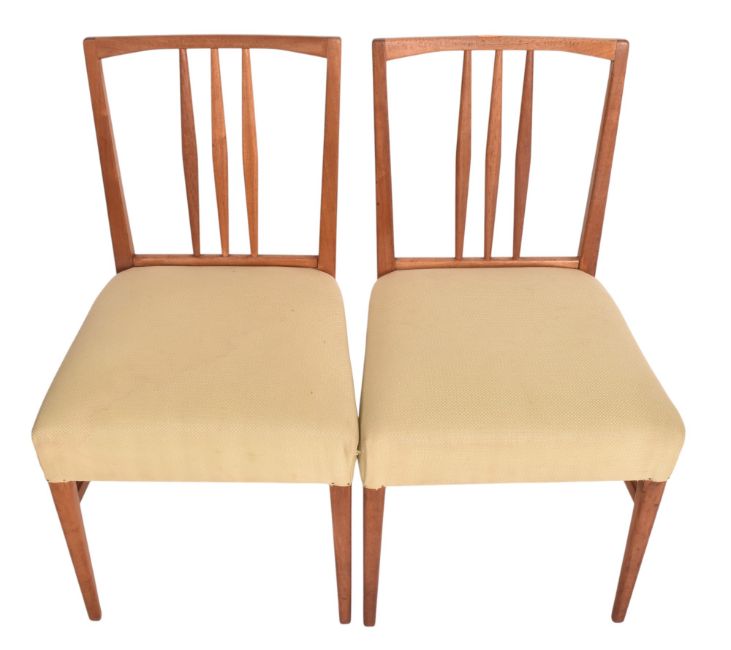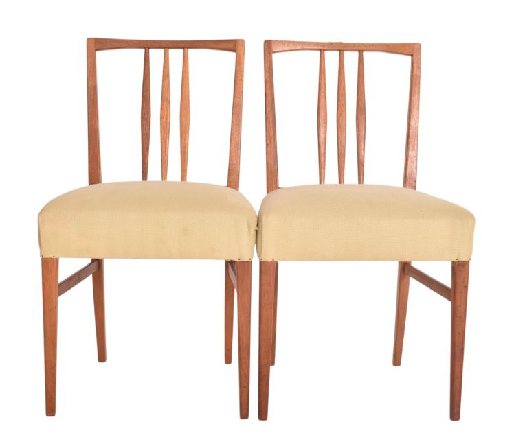 Gordon Russell - Burford Model - a matching set of six mid century British design teak framed dining chairs. Each chair having three central spindles with each having green upholstered overstuffed seats. Label present.