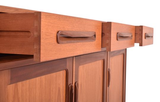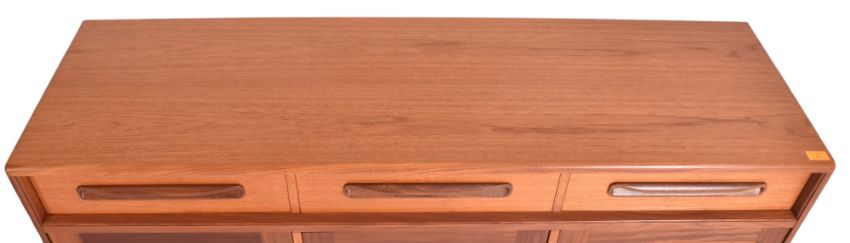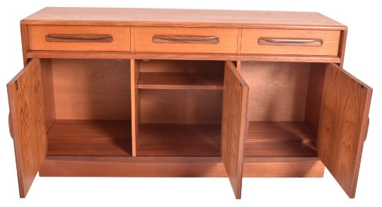 Victor B Wilkins for G-Plan - Fresco Range - a retro mid 20th century circa 1960s teak sideboard credenza. The sideboard having a straight top over three drawers with lip handles. Single and twin cupboard doors below, all raised on plinth base.