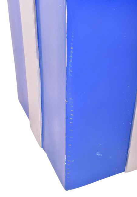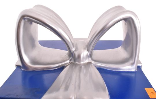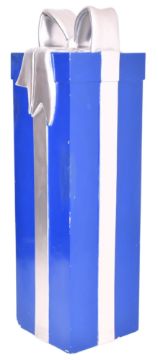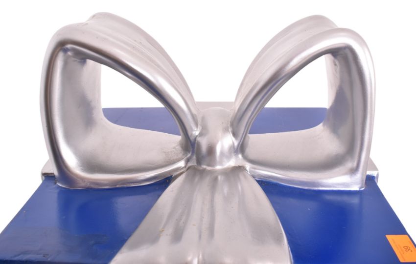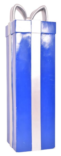 A vintage funfair / fairground amusement park fibreglass sculpture of a wrapped Christmas present. The present wrapped in blue with silver ribbon.
