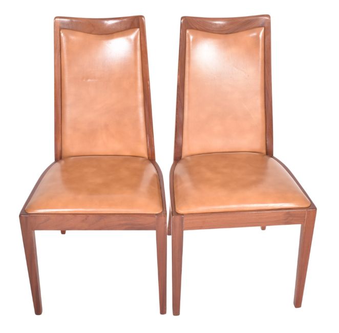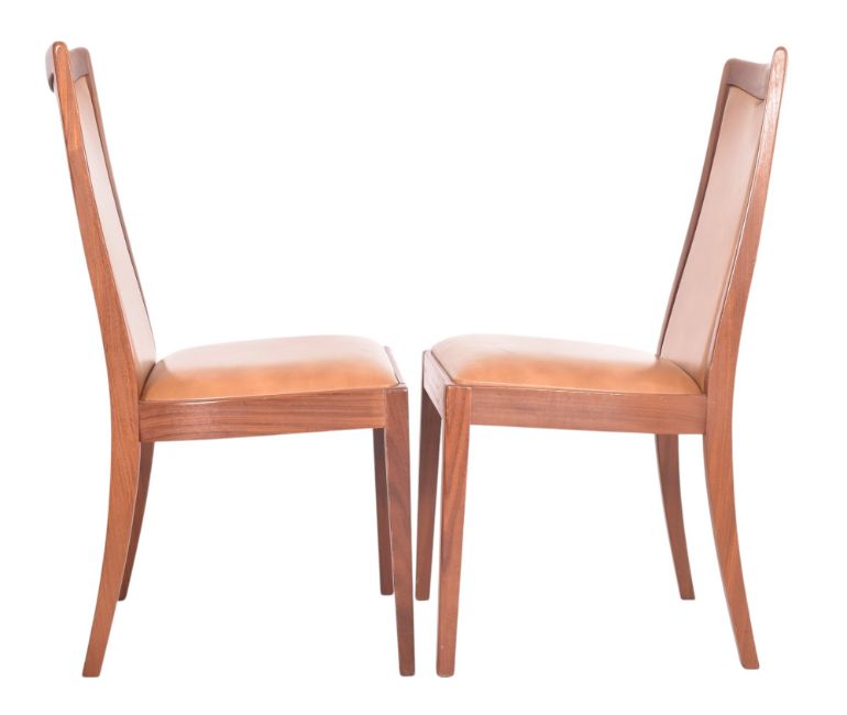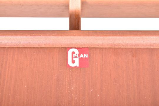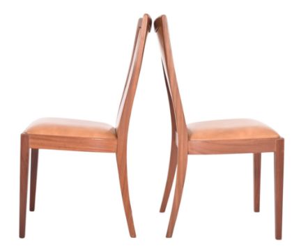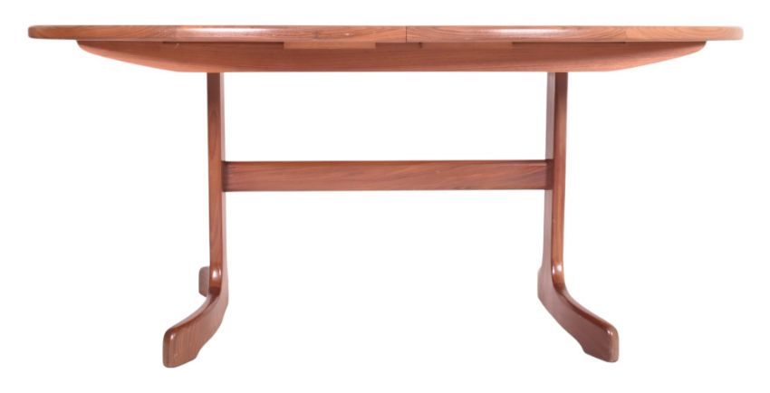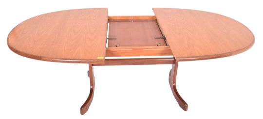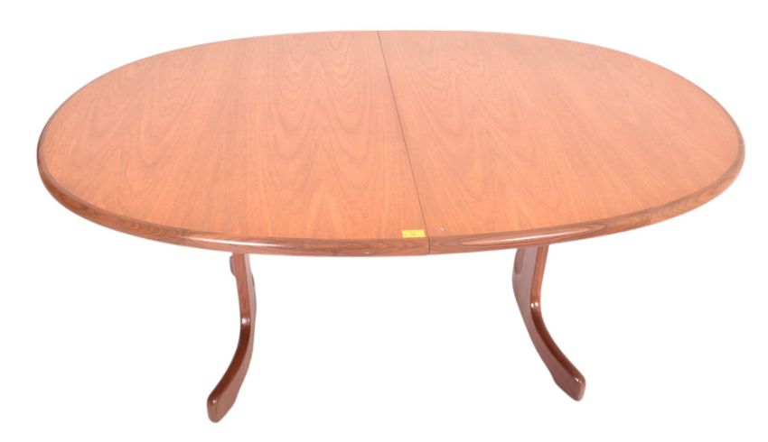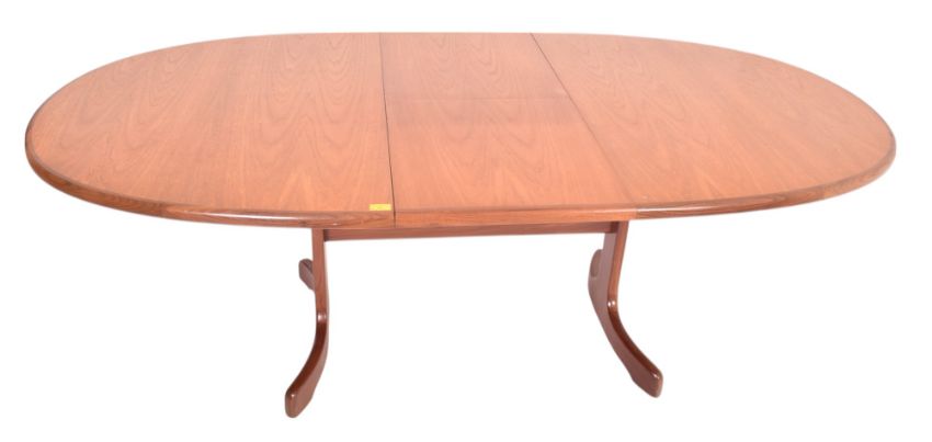 Victor B. Wilkins for G-Plan - Fresco Range - a retro mid 20th century circa 1960s teak wood large extending dining table and chairs. The table having an oval extending top all raised on curved pedestal supports. Together with eight leatherette & teak dining chairs, each with tan seats & back rests on tapering squared supports. Label to underside.