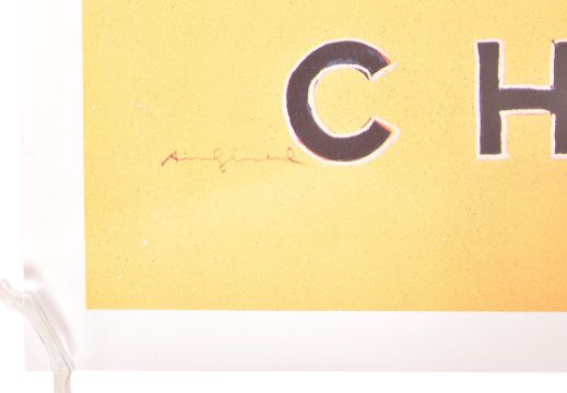 Andy Warhol (American, 1928-1987) - a vintage 1997 Chanel No. 5 pop art lithograph poster. The poster featuring Chanel No. 5 perfume bottle on blue & yellow ground. On paper backed linen. Unframed.