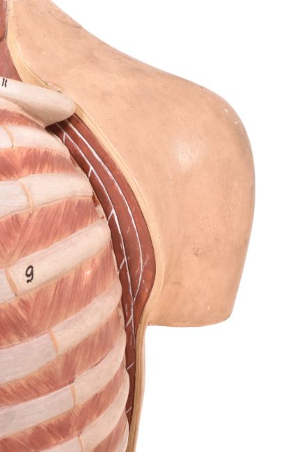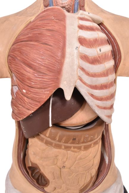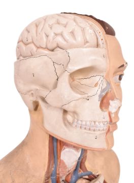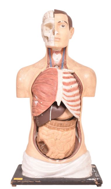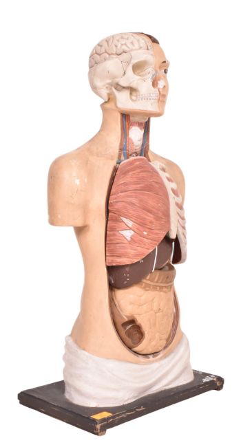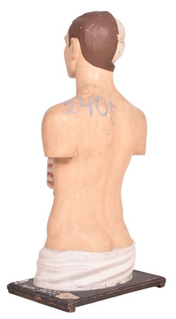 A mid 20th century hand painted plasticast anatomical medical bust mannequin. The bust including brain, skull and internal organs. With hand painted numbers throughout. Raised on wooden base.