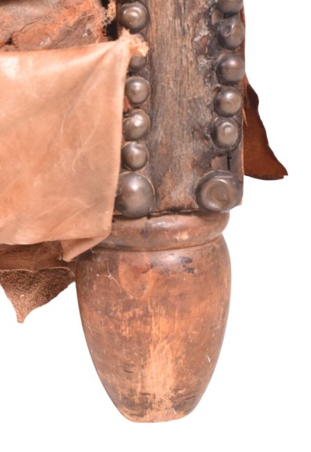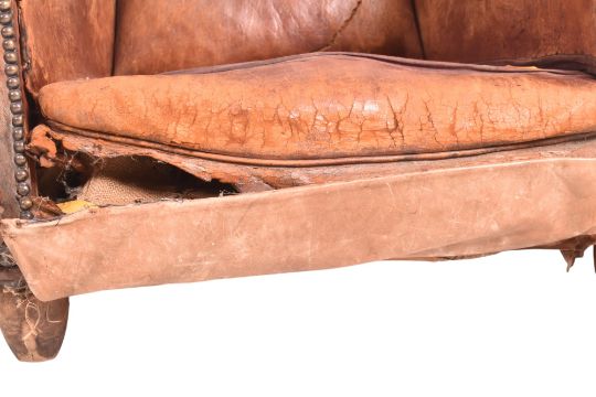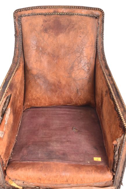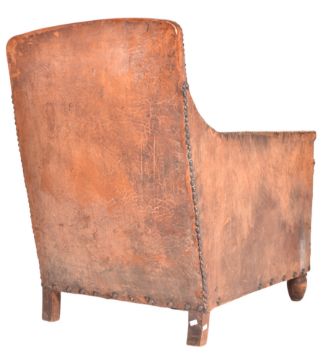 An early 20th century English Art Deco well-weathered leather club armchair / fireside lounge chair. The chair having a stuffed backrest with brass stud detailing throughout. The arm chair being upholstered in a tan brown leather with being raised on oak feet supports.