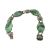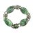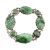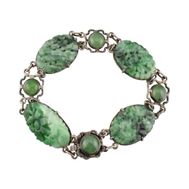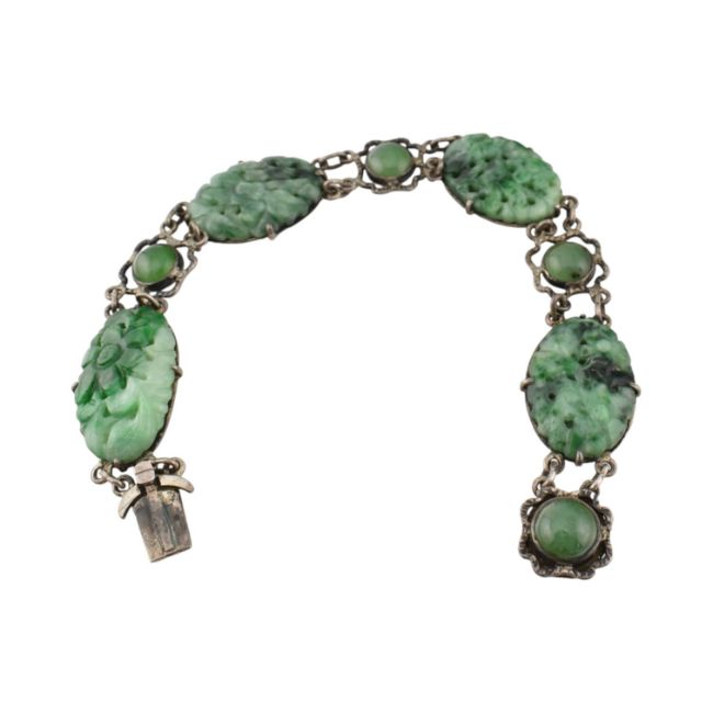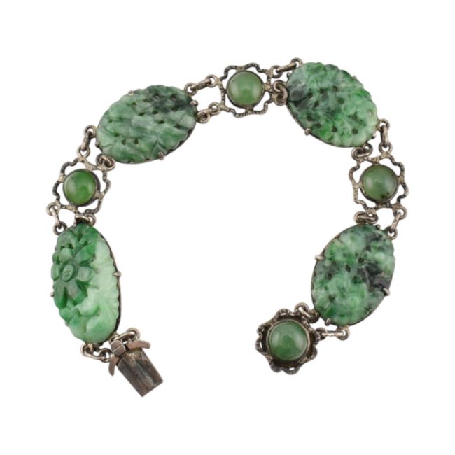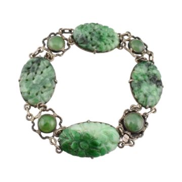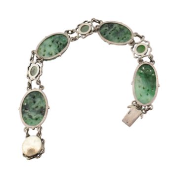 A white metal and carved jade panel bracelet. The bracelet set four carved jade floral panels with cabochons. Unmarked surface tests indicate silver in parts.