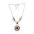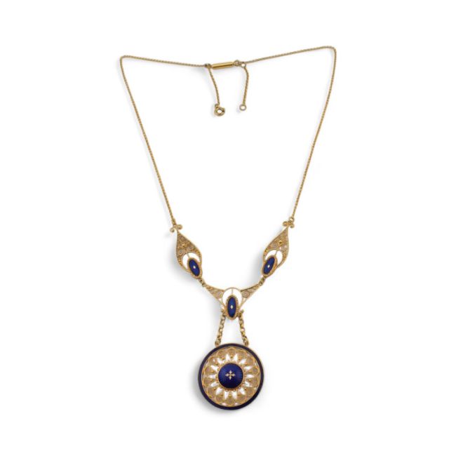 A 14ct gold and enamel set Art Nouveau pendant necklace. The fine chain with filigree worked enamel seat teardrop links to an enamel set roundel pendant. Weight 6.9g, measures 28cms. Pendant marked 585 MH.