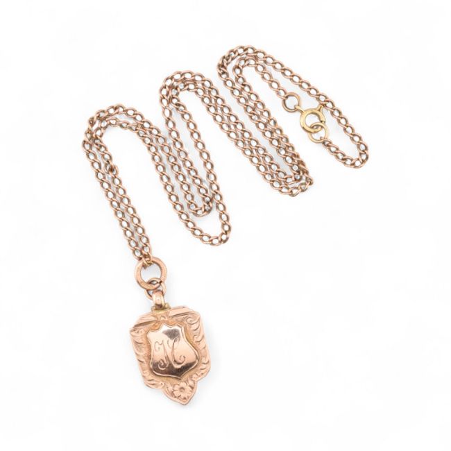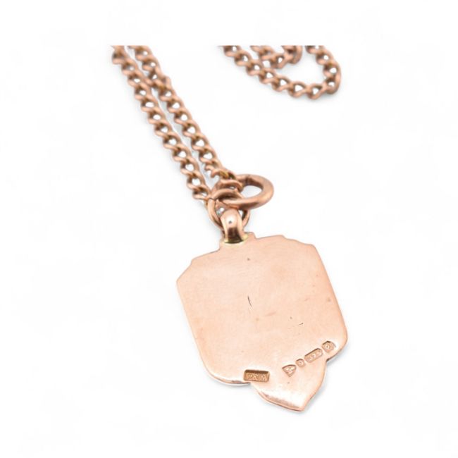 A 1930s hallmarked 9ct gold medal pendant strung on a rose gold chain. The pendant hallmarked Chester 1930 having a monogram shield. Total weight 17.9g. Medal 3.9g.