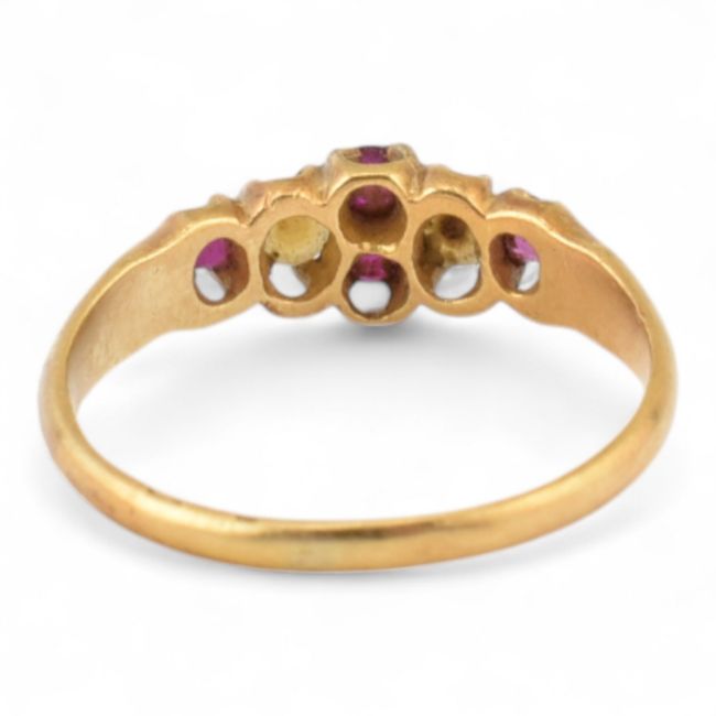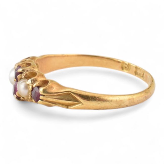 Victorian gold, pearl and ruby ring. Partial mark to band. Tests indicate 18ct gold. Weight 1.8g. Size K.