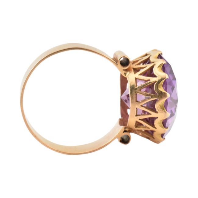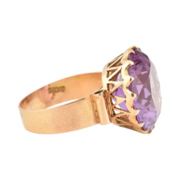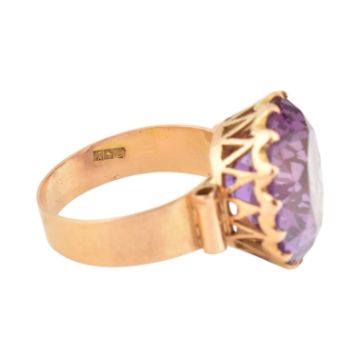 An 18ct gold and synthetic colour change sapphire cocktail ring. Egyptian assay marks for 18ct gold to shank. Total weight 7g. Stone measures 16mm dia x 9.2mm depth.