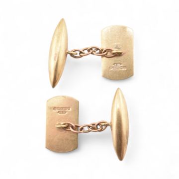 A pair of vintage hallmarked 9ct gold cufflinks. The cufflinks with a ribbed decorated head with chain link and torpedo fasteners. Hallmarked Birmingham 1994. Weight 3.7g. Measures 1.6cm.