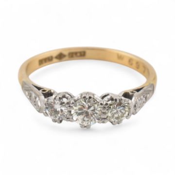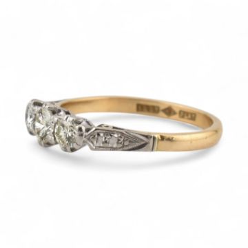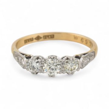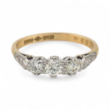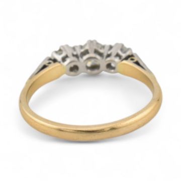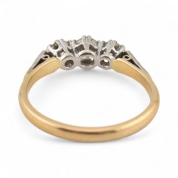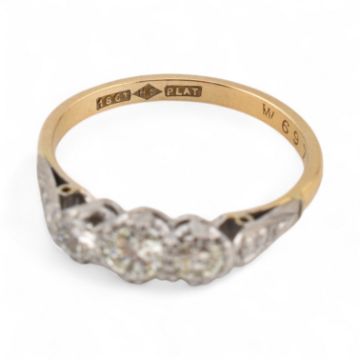 An 18ct gold and platinum three stone diamond ring. Stamped 18ct & Plat. Estimated dia weight 0.50cts. Weight 3g, Size O