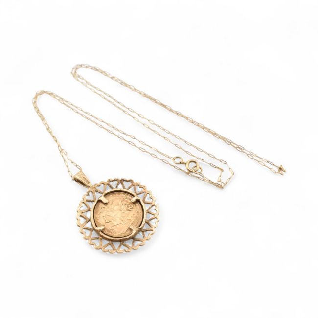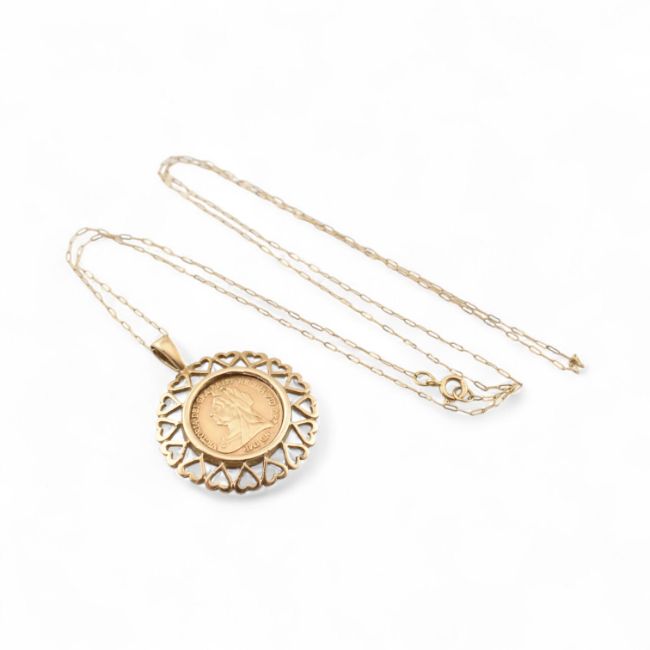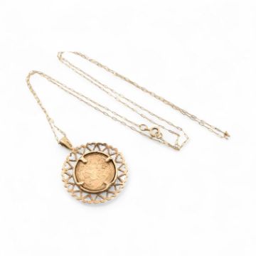 A 9ct gold faux coin pendant and necklace chain. Hallmarked London to the bale. Weight 2.9g, chain measures 50cm approx