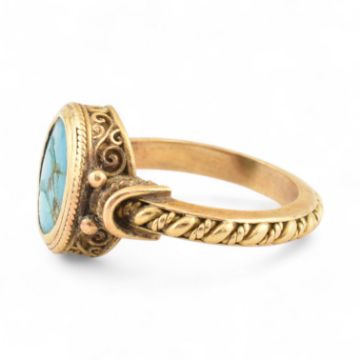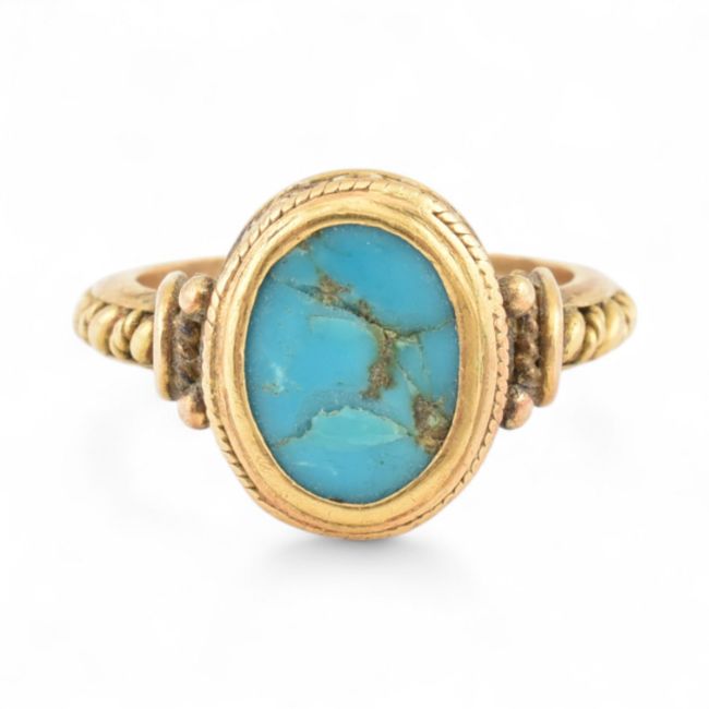 An 18ct gold and turquoise Etruscan ring. Unmarked, tests indicate 18ct gold. Weight 7.9g, size Q