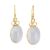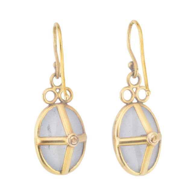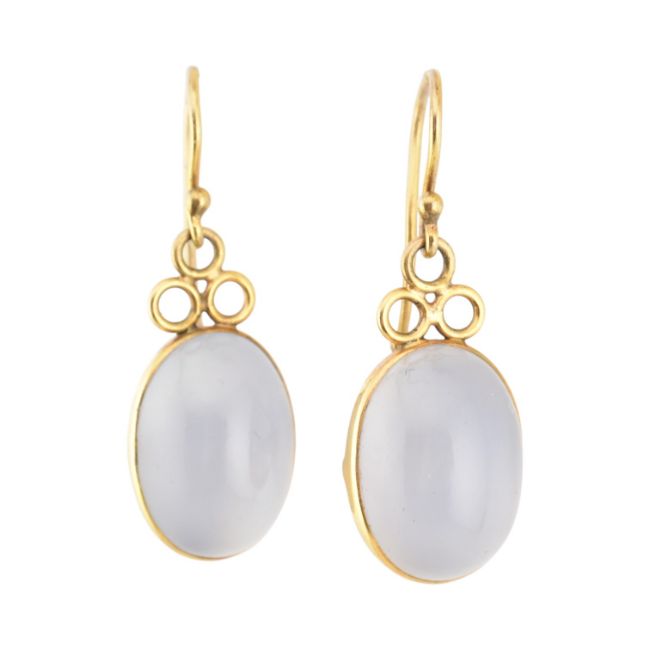 A pair of blue chalcedony pendant earrings. The earring set with large blue chalcedony cabochons to a basket mount with hook fasteners. Unmarked. Weight 11.6g. Measures 3cm.