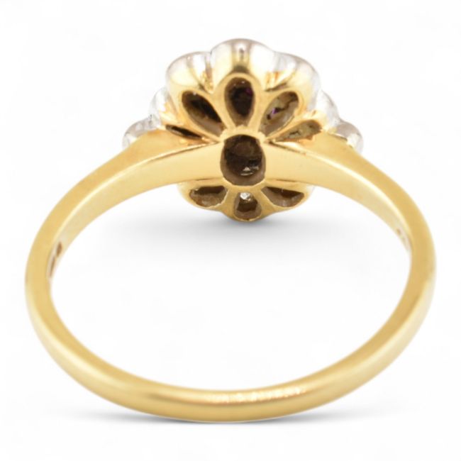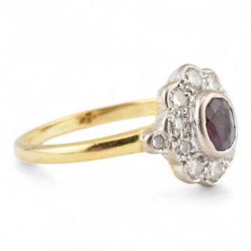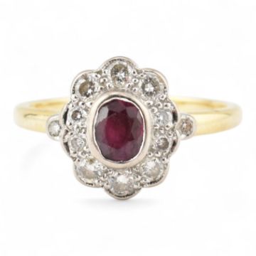 A hallmarked 18ct gold ruby and diamond halo ring. Hallmarked London. Weight 3.4g. Size L.