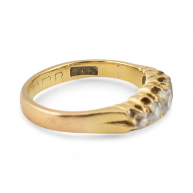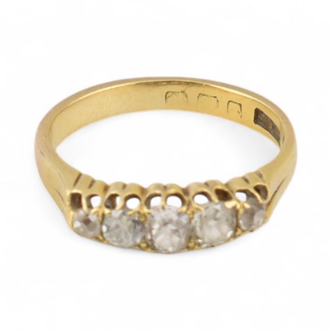 A hallmarked 18ct gold and diamond five stone ring. Estimated dia weight approx 0.25cts. Hallmarks partially rubbed. Weight 3.3g, size J