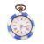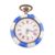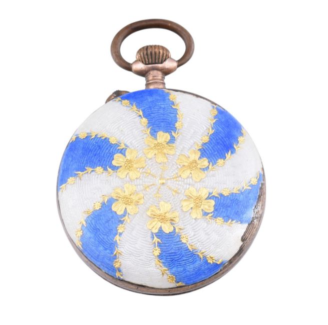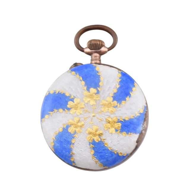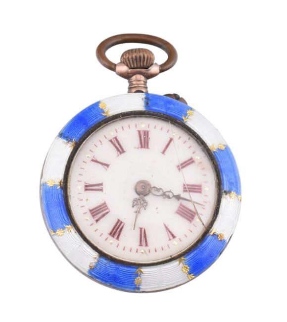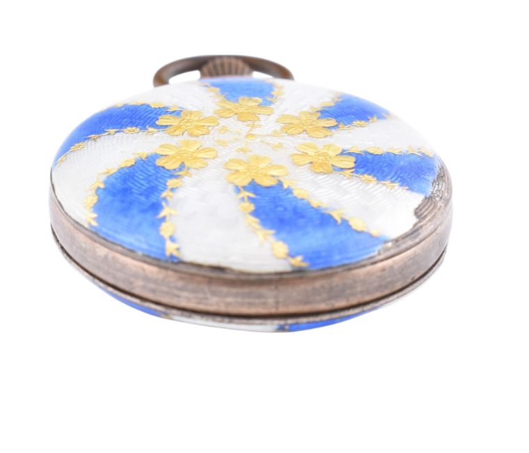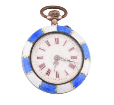 A silver and enamel fob watch. The fob watch having a round dial with Roman numeral indices and Louis XV hands to blue and white enamel border to enamel verso with foliate decoration. Marked 800 to inner case. Measures 3.9cm x 2.7cm. Weighs 20.0g. All weights, measurements and sizes are approximate. All watches are sold as untested and as found.