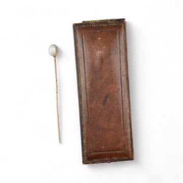 A gold and pearl stick pin together with a part 9ct gold chain necklace. The stick pick surmounted by a pearl, unmarked surface tests indicate gold, cased. The chain with a broken link is hallmarked 9ct gold. Chain weight 2g. Pin 1.3g.