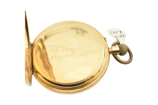 Usher and Cole Edwardian hallmarked 18ct gold open face pocketwatch. The pocket watch with white enamel dial having Roman numeral hour markers, outer minutes track with subsidiary seconds dial at six o'clock. The backplate is engraved Usher & Cole London. Hallmarked London 1903. Sponsor mark G.B. Movement number 30267. Total weight 62.5g. Measures case excluding winder 4cm. All weights, measurements and sizes are approximate.