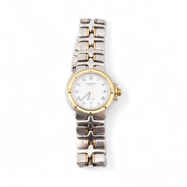 A collection of three Raymond Weil wristwatches. To include a bi-colour white dial ' Parsifal ' wristwatch serial 9990 A341775. Also, a 18ct gold plated Raymond Weil wristwatch set to a black leather strap and a Raymond Weil W1 black dial wristwatch with black leather strap. Serial 3000 A954020