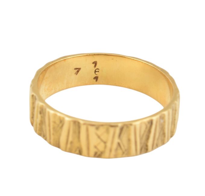 A 1970s hallmarked 18ct gold band ring. The ring with textured decoration. Hallmarked London 1976. Weight 3.4g. Size N.