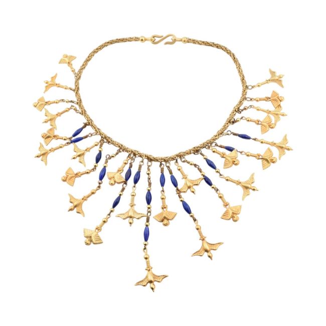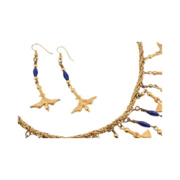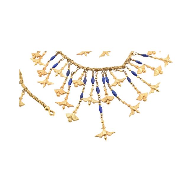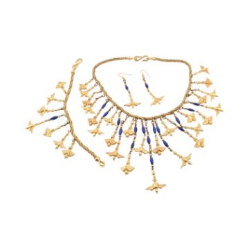 1990s Liberty of London necklace, bracelet and earring suite. The set being part of the Minoan & Mycenaean theme jewellery range that was released in 1993.The jewellery is strung with drop pendant birds and lapis lazuli spacers. Complete with paperwork, original receipt and box.