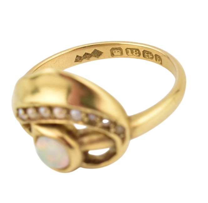 Liberty and Co - Hallmarked 18ct gold opal and pearl ring. The ring set with a round opal cabochon exhibiting a full spectrum play of colour with a pearl set foliate mount to a plain band. Hallmarked Birmingham 1901. Makers mark L & Co. Presented in a Liberty Regent Street London ring box. Size O. Weight 4.6g.