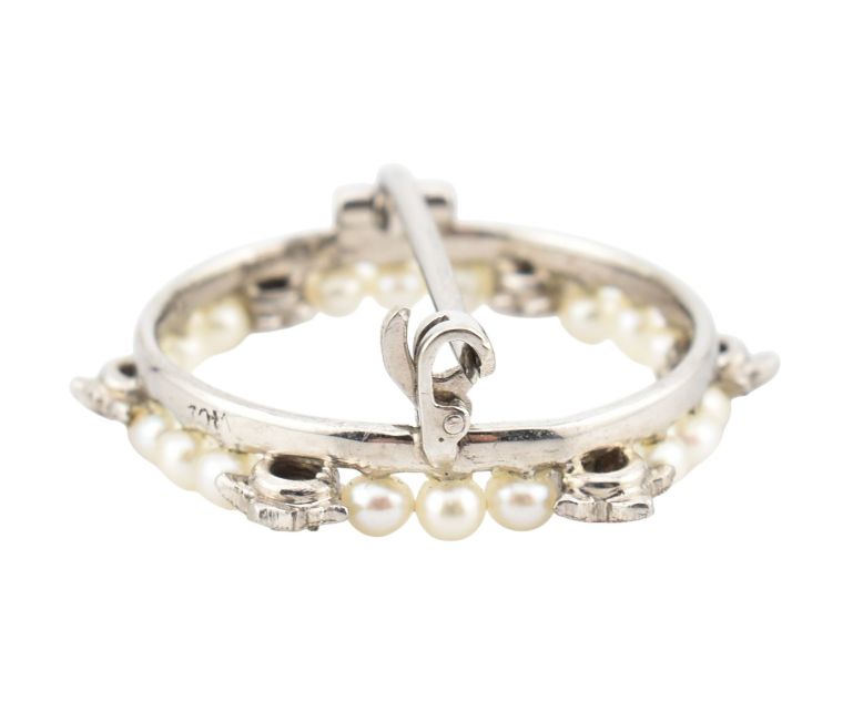 A 1930s 14ct gold and platinum pearl and diamond brooch pin. The brooch in wreath form, set with pearls and diamonds having lily motifs with millegrain decoration. Presented in case for James Walker Goldsmith and Diamond Merchant, 290 Oxford Street W. Total weight 2.7g. Measures 2.2cm. All weights, measurements and sizes are approximate.