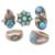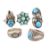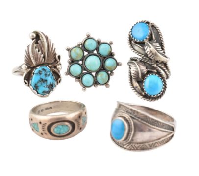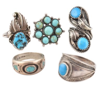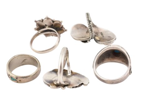 A collection of five 925 silver and turquoise rings. The rings to include one ring signed SN likely Native American. The remaining are marked 925 or Sterling. Sizes G - Q. Total weight 28.3g. All weights, measurements and sizes are approximate.