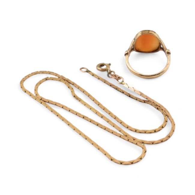 A 9ct gold flat linked necklace chain. Stamped 9ct. Weight 3.2g. Together with a 9ct gold cameo ring. Stamped 9ct. Weight 2.8g. Total combined weight 6g