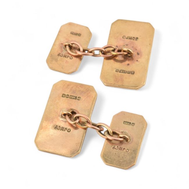 A pair of hallmarked 9ct gold cufflinks. Engine turned decoration with uniting chains. Weight 7.7g