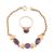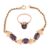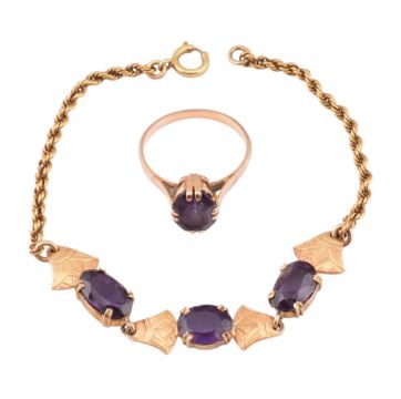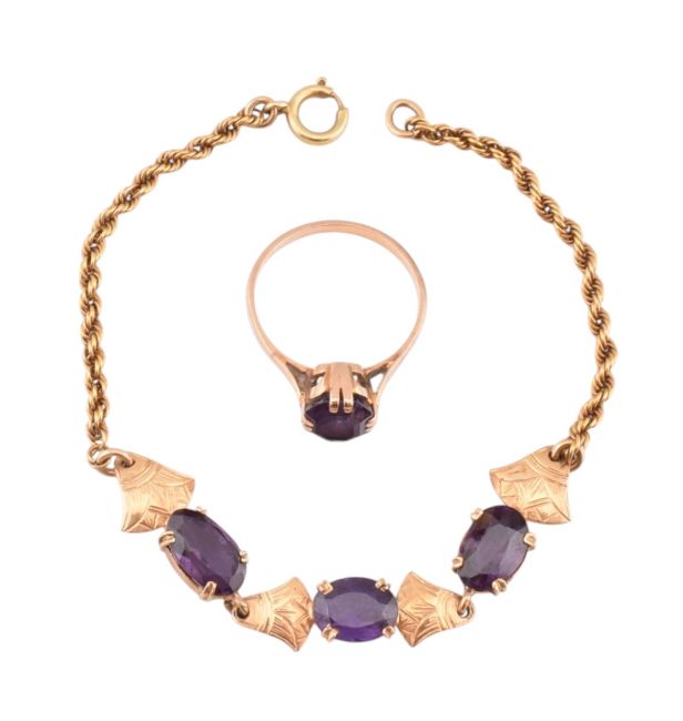 A gold and synthetic sapphire bracelet together with a matching ring. The bracelet strung with four Egyptian lotus flowers interspersed with three oval cut synthetic colour change sapphires, together with a solitaire ring. Unmarked tests indicate 18ct gold. Bracelet measures 17.5cm. Ring size O.5